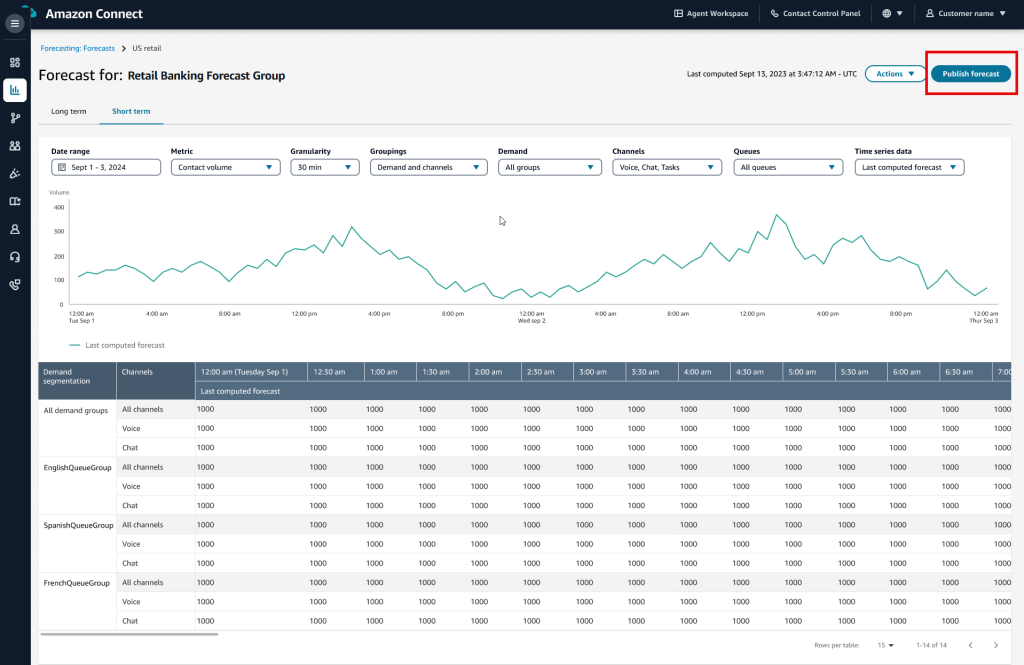 In summary, for our scenario, the bank can establish three distinct demand groups: one dedicated to English queues; one dedicated to Spanish queues; and the last one dedicated to French queues. The bank can then independently forecast contact volumes for each. These demand groups are mapped to agents with the corresponding language skills. Amazon Connect schedules each demand group autonomously, ensuring that agent work schedules and break periods align with coverage requirements. Amazon Connect utilizes artificial intelligence to strategically deploy trilingual agents, addressing staffing imbalances between queues while maintaining the required service level agreement (SLA). The high level workflow is shown in FIG 1 below.