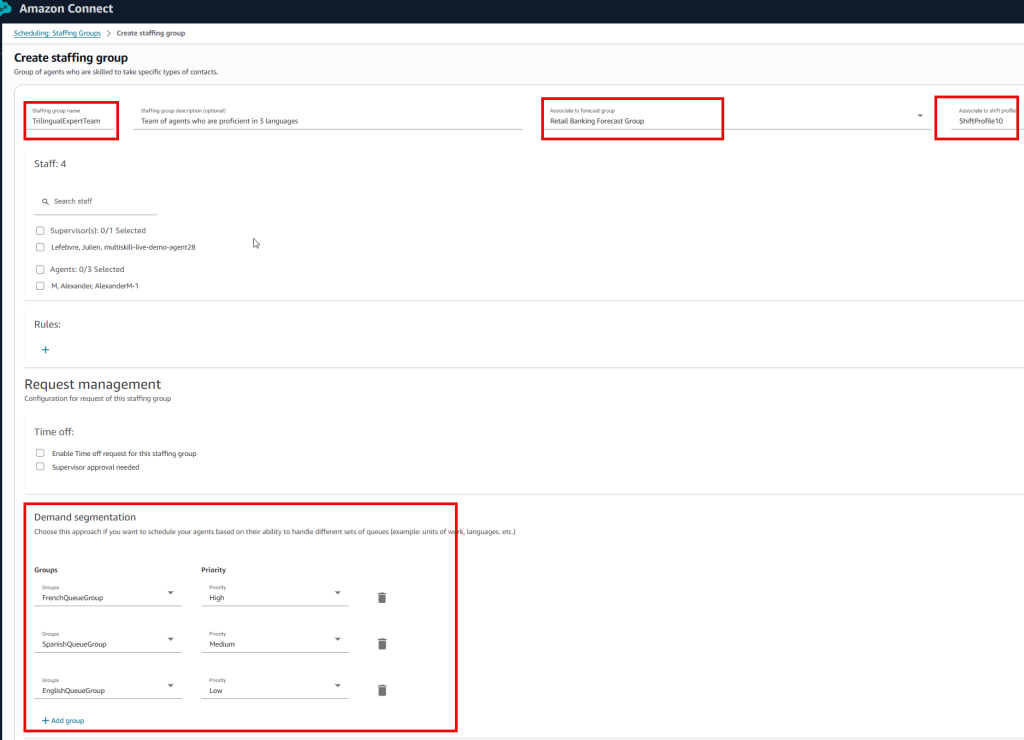 - Staffing groups: Teams of agents organized by their skill sets, with priority assignments for different demand groups. NOTE: Staffing groups already exist within Amazon Connect (see here for details). They have been updated as part of this capability and hence, are noted here for continuity.