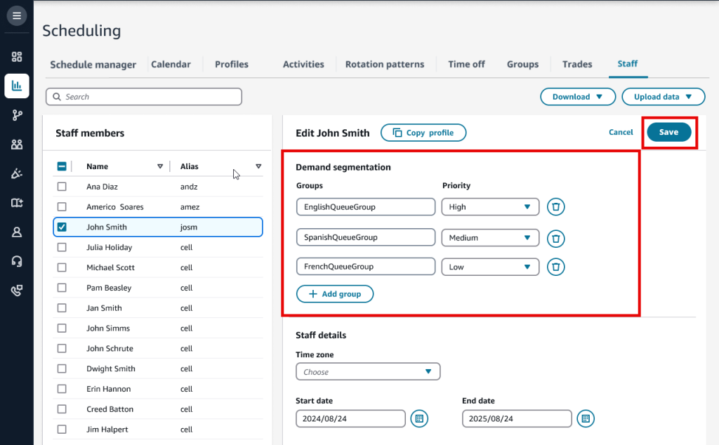 Amazon Connect now allows for a Staffing Group (SG) to utilize a Demand Group (DG), and supports priority assignment for each DG within the SG. This functionality is available when the Forecast Group (FG) linked to an SG includes one or more DGs. Using our banking scenario, we could configure two SGs as shown in TABLE 3:
