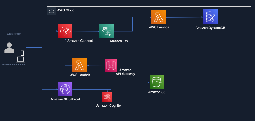 The second time, instead of calling, the customer initiates a chat from the web application, a request is sent to Amazon Connect through, Amazon CloudFront, Amazon API Gateway and AWS Lambda function. The chatbot (Lex Bot) fetches the past snapshot from the Amazon DynamoDB table, using AWS Lambda function and resumes the conversation from the point where customer left on the voice bot. Customer need not to repeat the information on chat , which they already provided via voice.