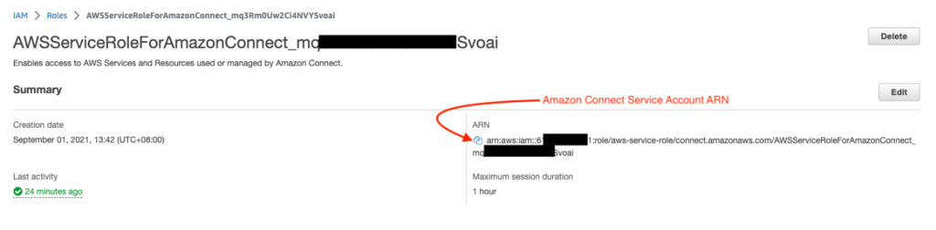 - Amazon resource name for the service-linked role associated with your Amazon Connect instance