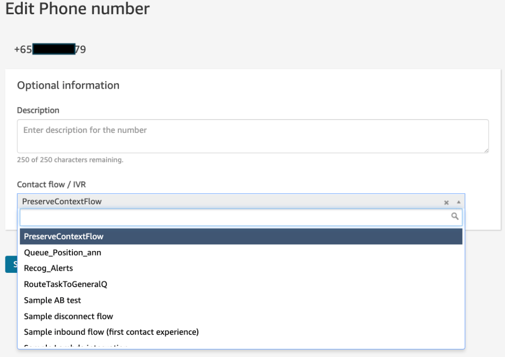 - Associate a phone number with the PreserveContextFlow contact flow, created by the CloudFormation stack and click on Save.