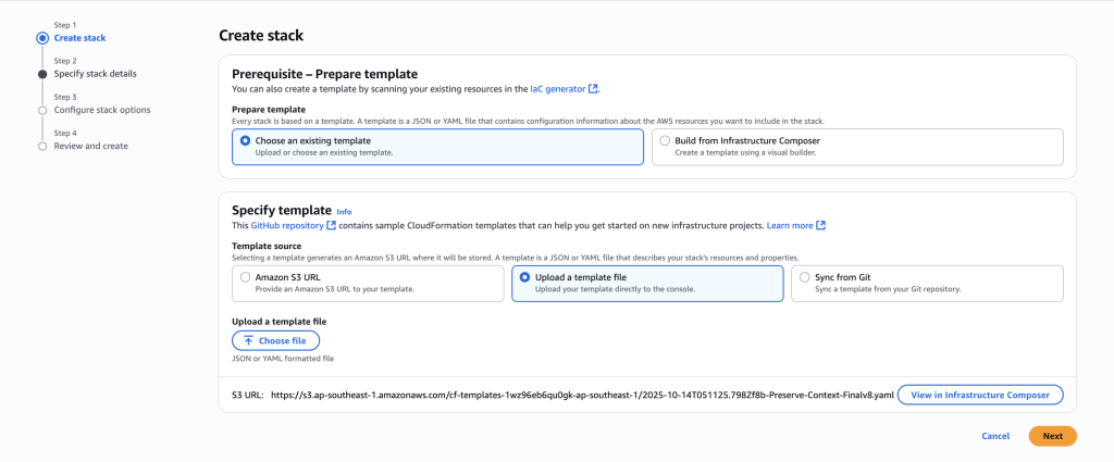 - Select Upload a template file, click Choose file and upload the downloaded cloud formation template