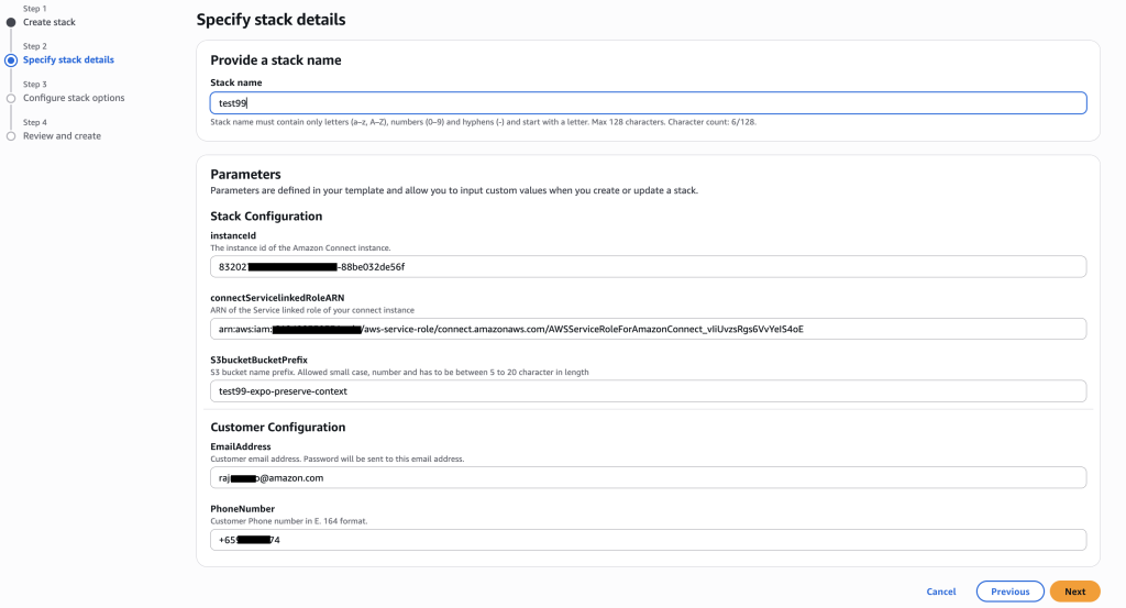 - In the parameters section, enter email address for customer facing web application authentication, customer phone number, s3 bucket prefix where a sample web application will be stored, the ARN of the service-linked role that you noted down earlier, the Amazon Connect instance ID and click on Next.