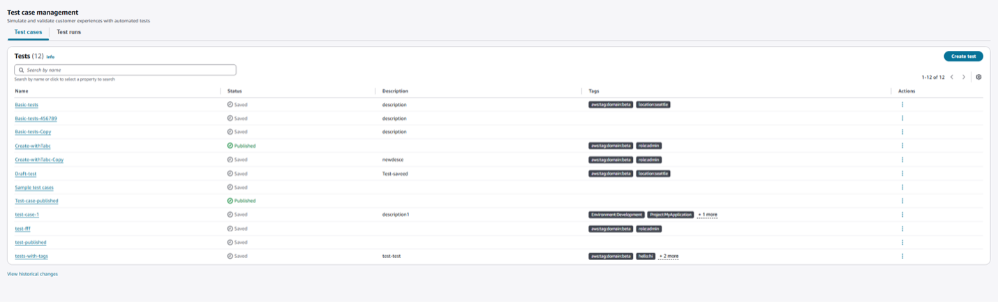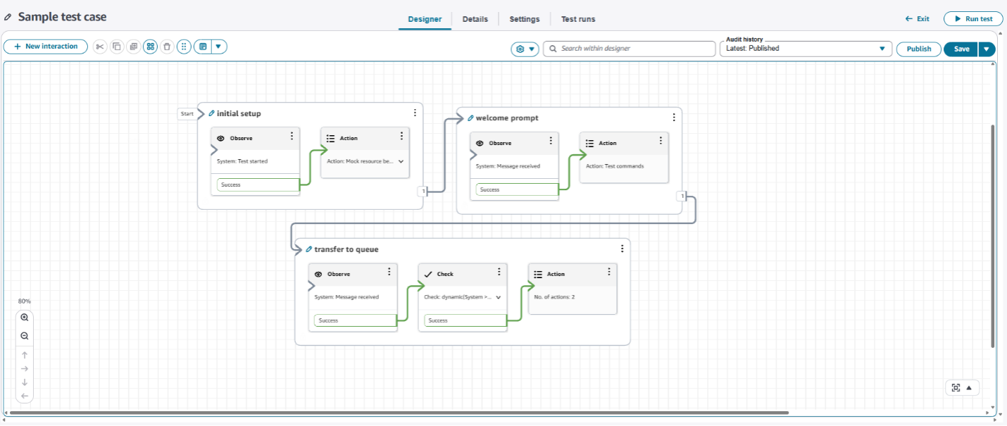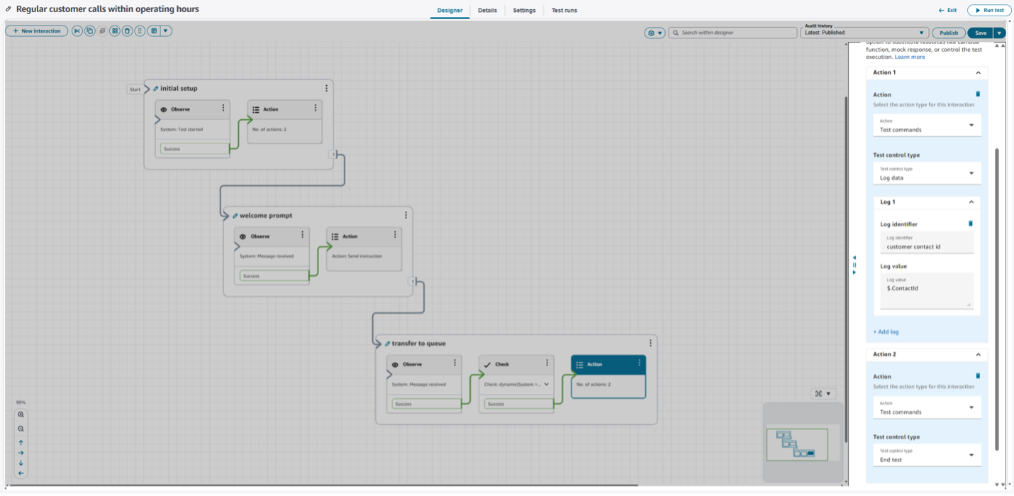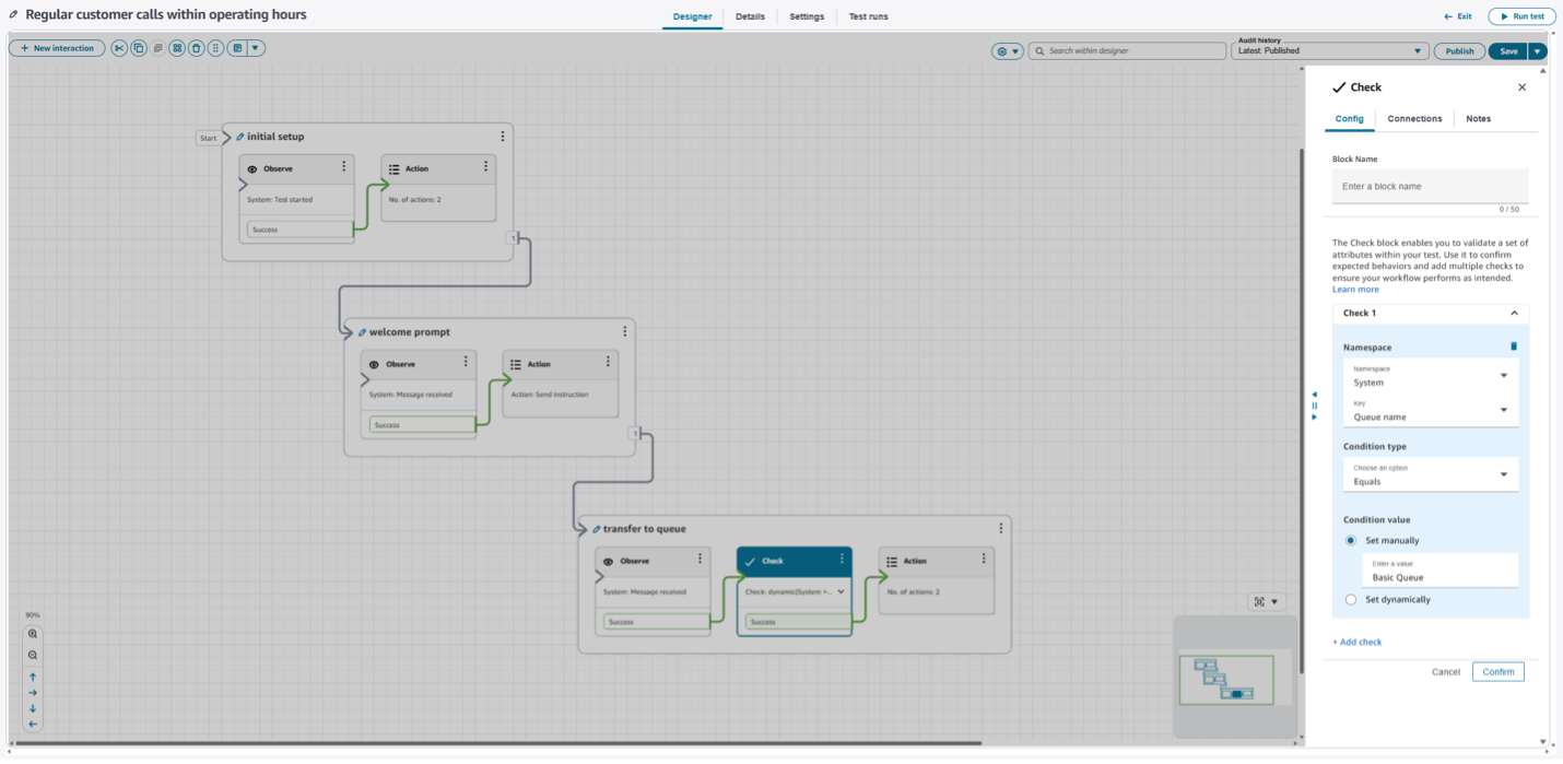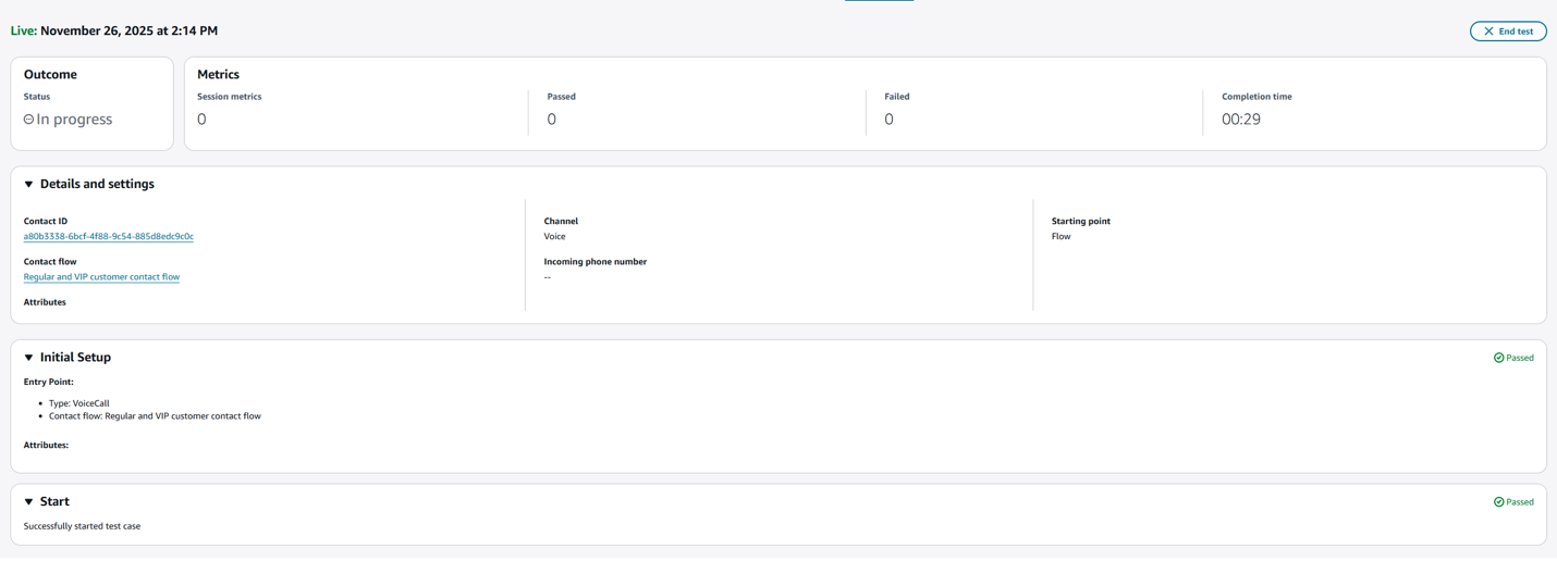 Execute tests directly from the test designer using the Run test button, or from the test case management page for batch execution. Amazon Connect supports up to five concurrent test executions per instance, with additional tests queued automatically. This allows you to test primary changes and get results before executing regression tests that may take longer.