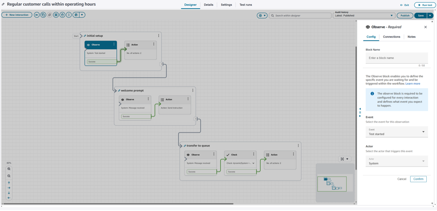 Observe Block: Specify the expected confirmation message: “Thank you for calling. Your call is very important to us and will be answered in the order it was received.”