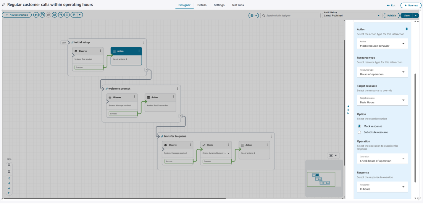 Action block: Configure an override for your Hours of Operation resource. This ensures your test runs as if it’s during business hours, regardless of when you execute it. Select your flow’s Hours of Operation resource and mock the response to be “in hours” when check hours of operation is invoked in the flow or specify a replacement resource that’s always open.