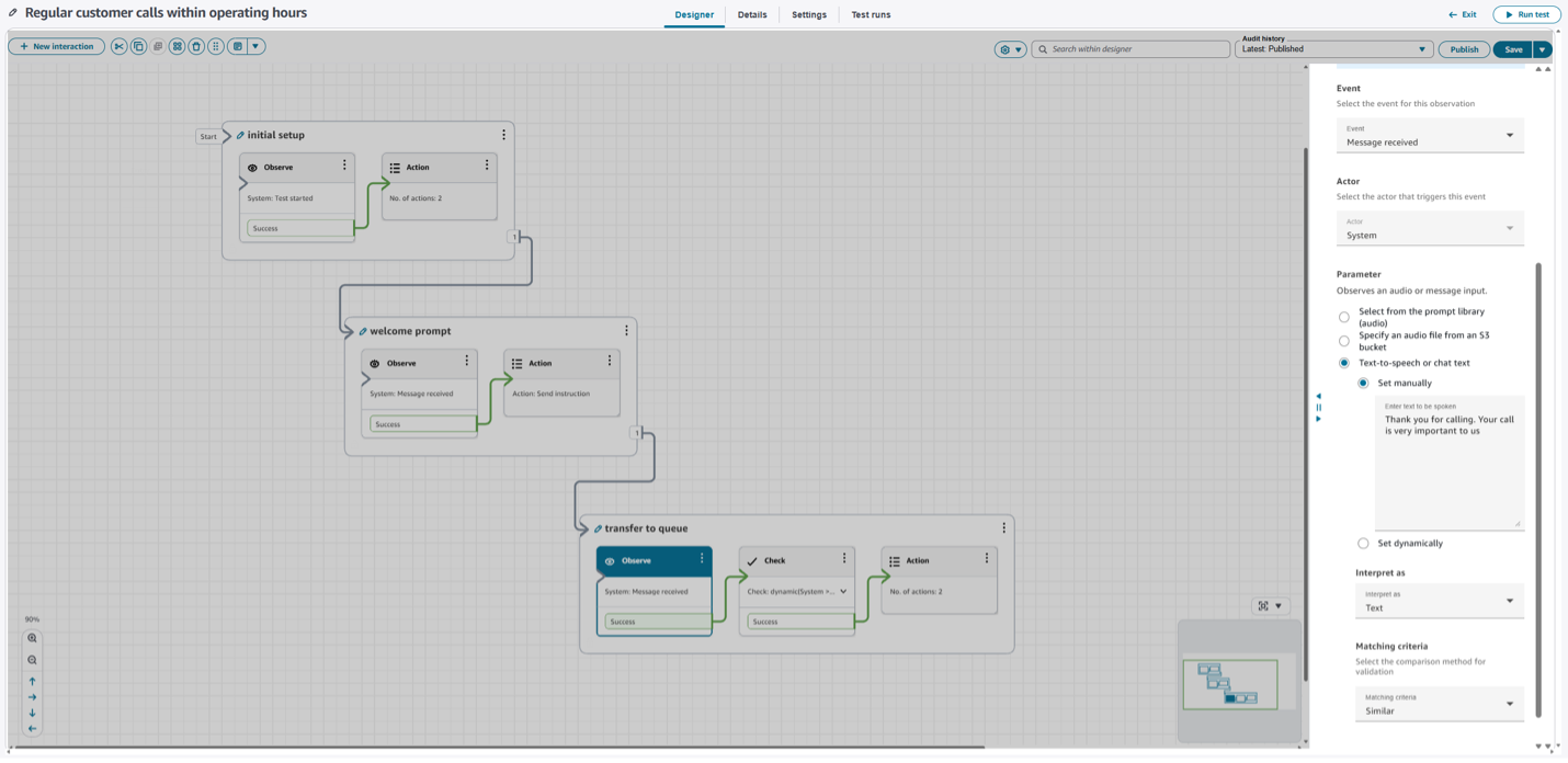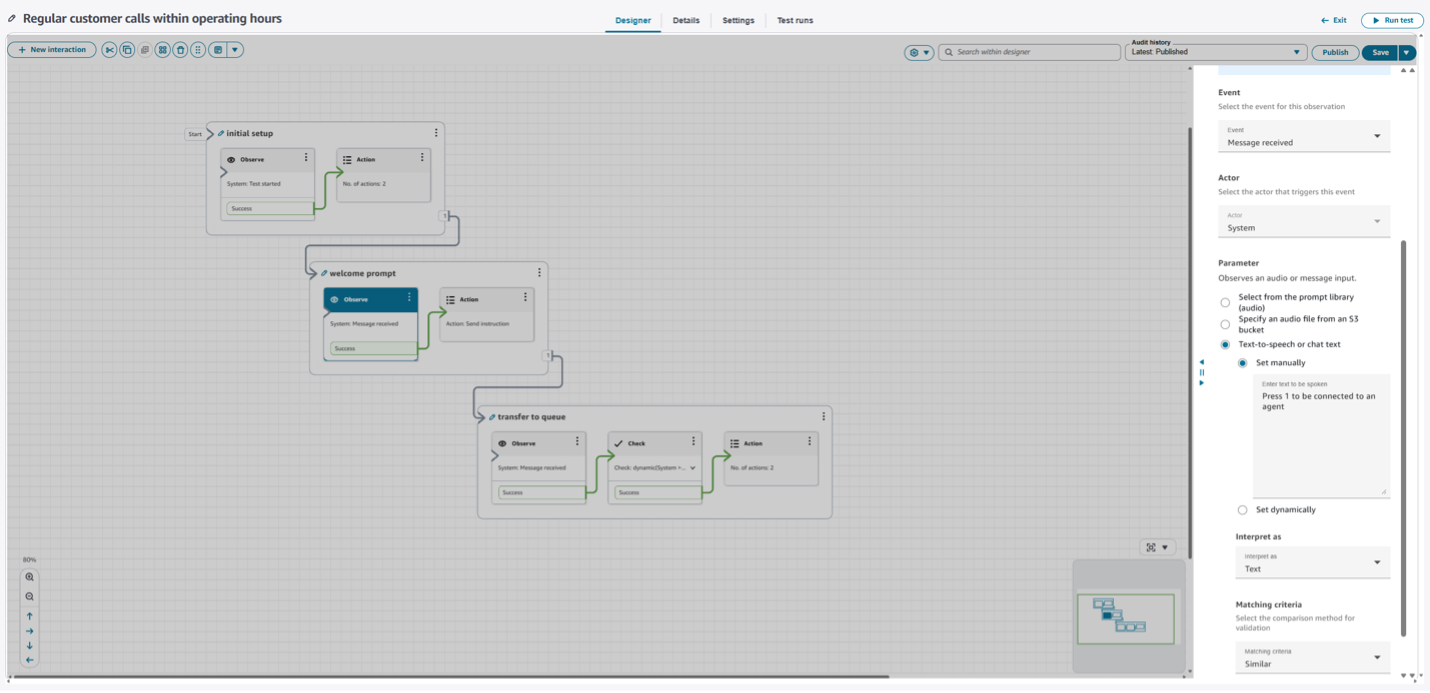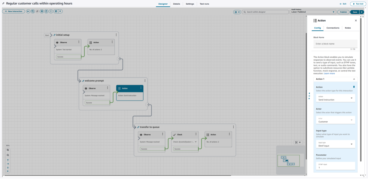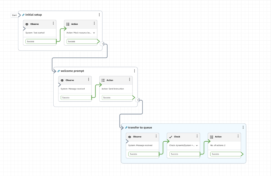 Amazon Connect’s testing and simulation framework provides a comprehensive solution for validating contact center experiences through an intuitive visual interface. Unlike traditional testing approaches that rely step by step guides and complex transitions, this framework uses natural, user-friendly concepts that mirror how customers actually interact with contact centers.