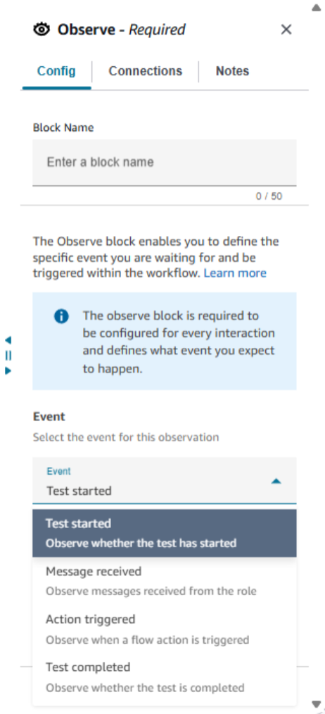 Observe Block (Required): Defines expected system events like “Test started,” “Message received,” or “Action triggered.” For message-based observations, choose between: