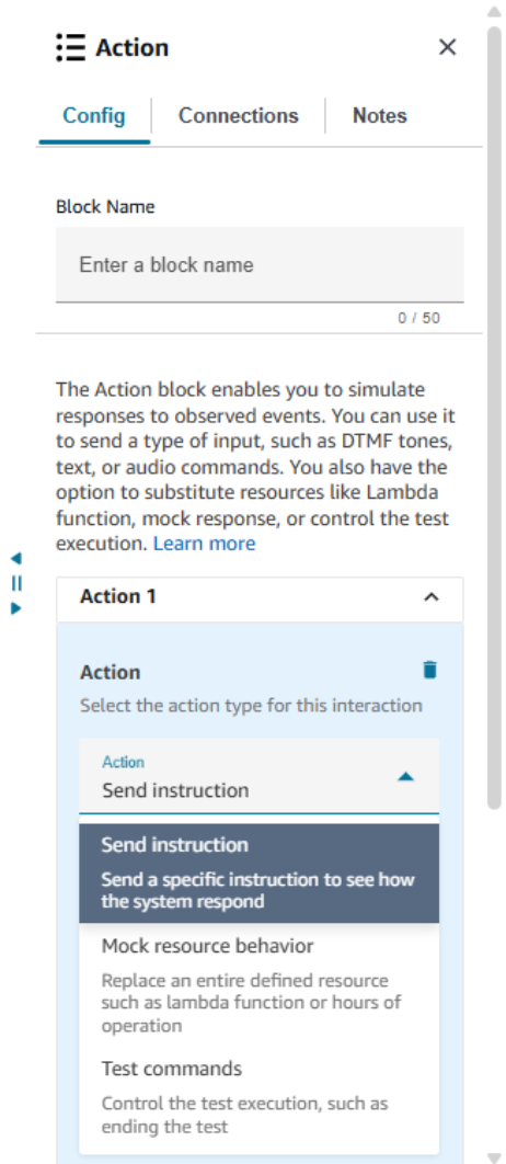 • Send instruction: Simulate customer input (DTMF tones, text utterances, call disconnect)
