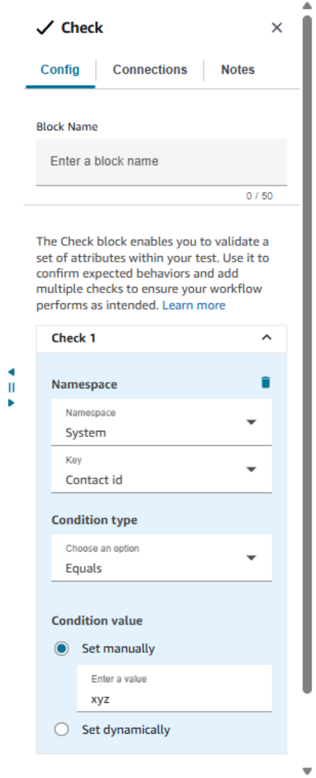 Check block (optional): Validates those specific attributes contain expected values at that point in the contact journey. Configure attribute validations by specifying namespace (e.g. System, User defined, or Segment Attributes), attribute key, and expected value.