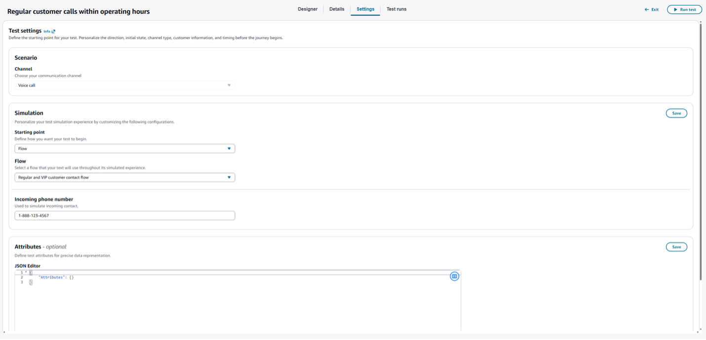 Select the contact flow you want to simulate and enter an incoming phone number as the identity of the customer.