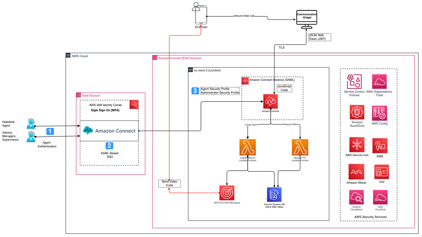 The solution integrates Amazon Connect with other AWS services to create a secure, enterprise-scale video calling solution for customer support. In this blog post, you will learn how to implement video calling using out-of-the-box Amazon Connect capabilities for customer authentication. We leverage AWS End User Messaging to send an SMS with a one-time password and video session link to the user’s mobile device. This ensures that the video call is routed to the same agent with whom the customer was conversing.
