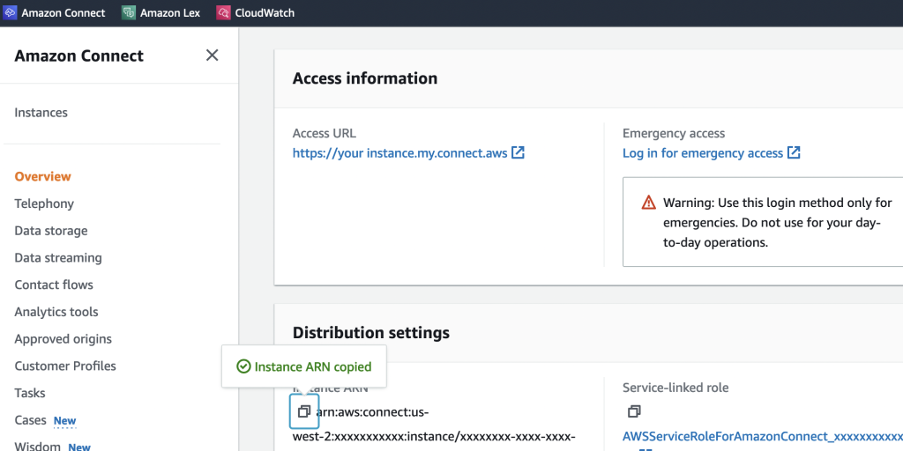 - Navigate to Overview and click the ‘Copy’ button next to your Instance ARN