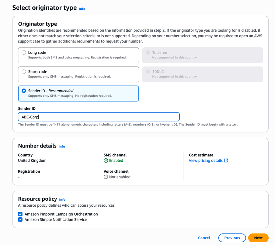 5. Paste the Sender ID created in AWS EndUserMessaging and click Next.
