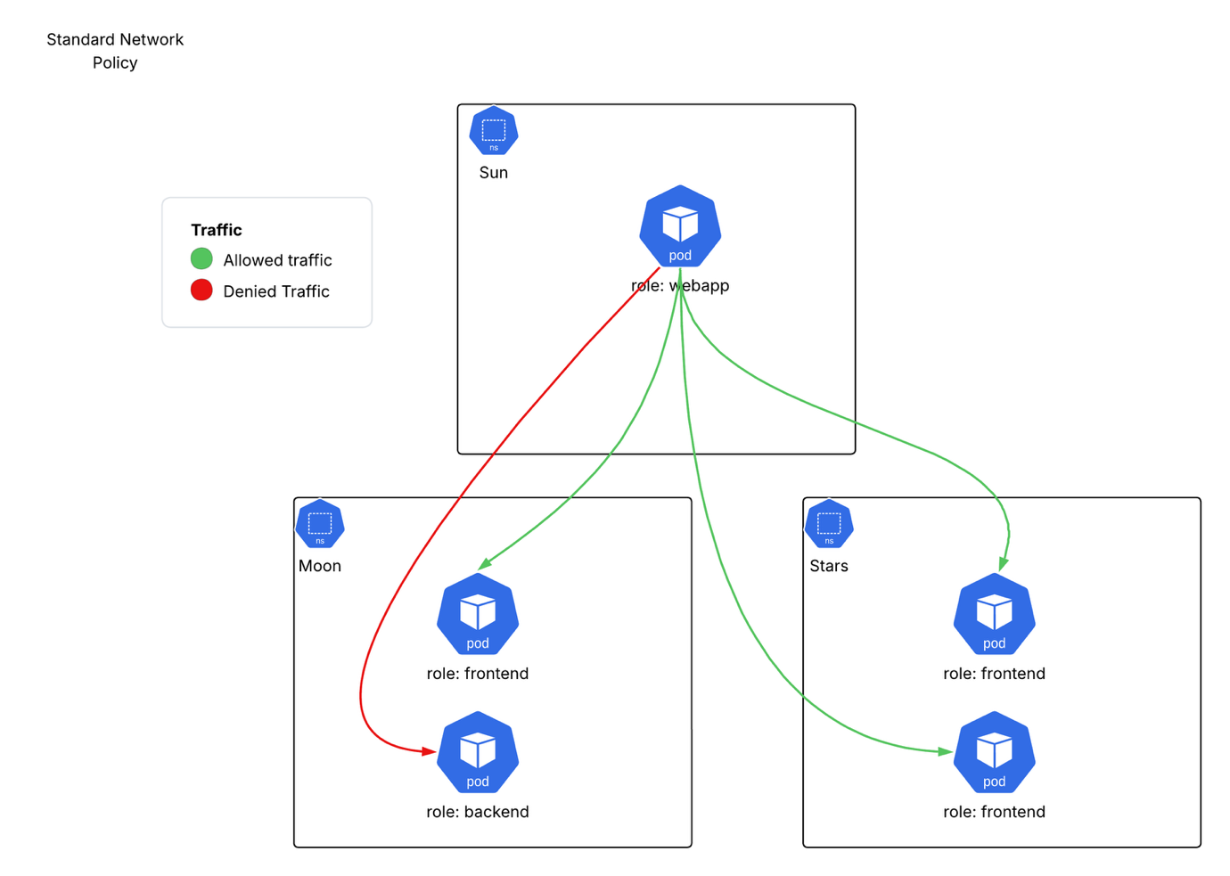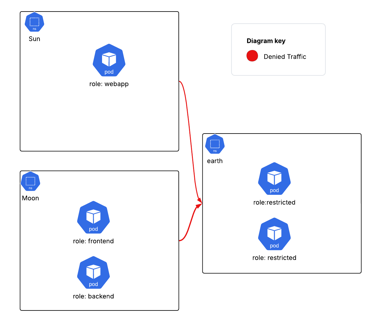 role: frontendin the stars namespace on TCP port 8080 - Blocked traffic: All other outbound traffic from webapp pods is implicitly denied.