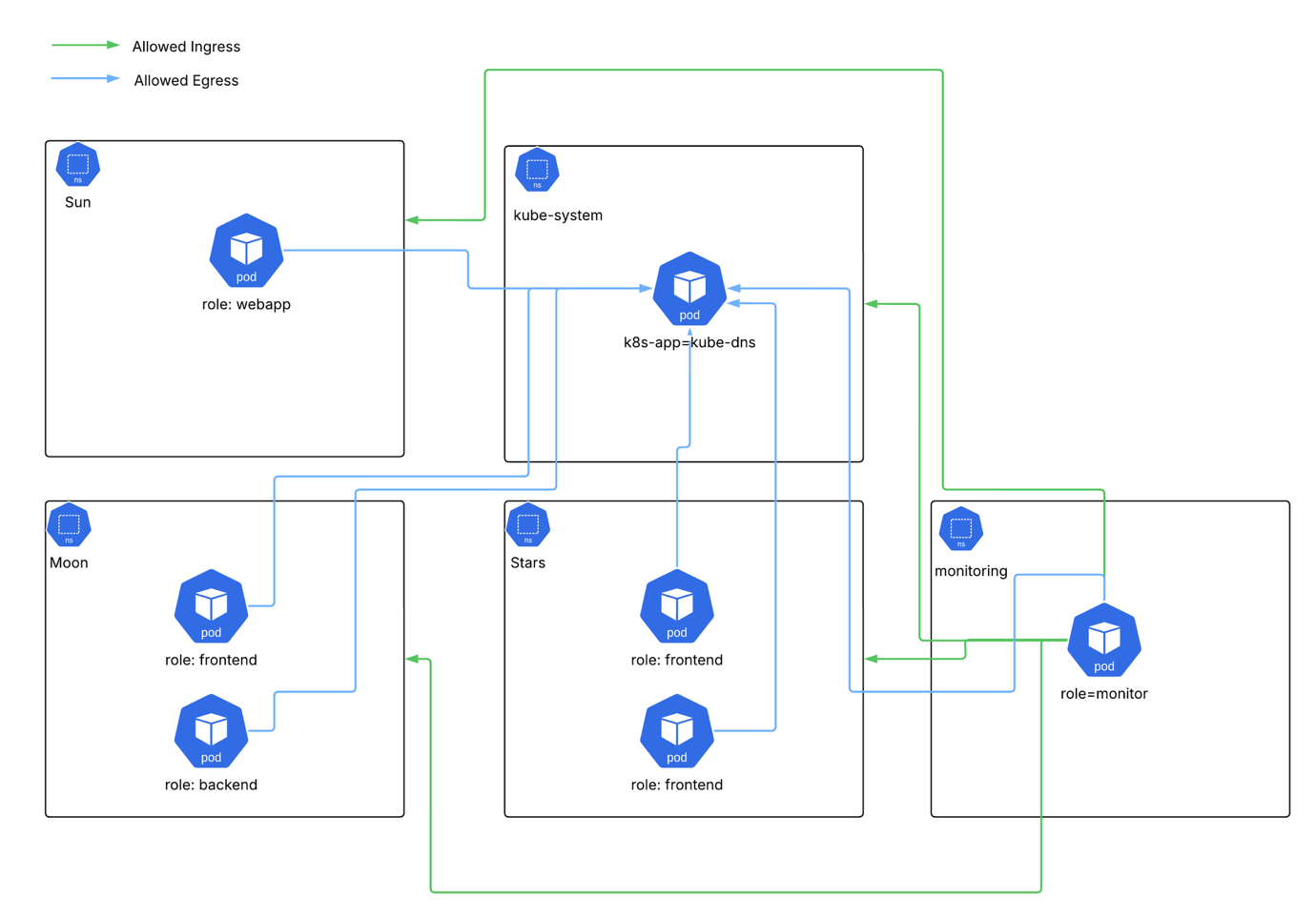 This enforces all namespaces to accept incoming traffic from the monitoring namespace and to allow egress to pods labelled as kube-dns that reside in the kube-system namespace resulting in the following traffic flows: