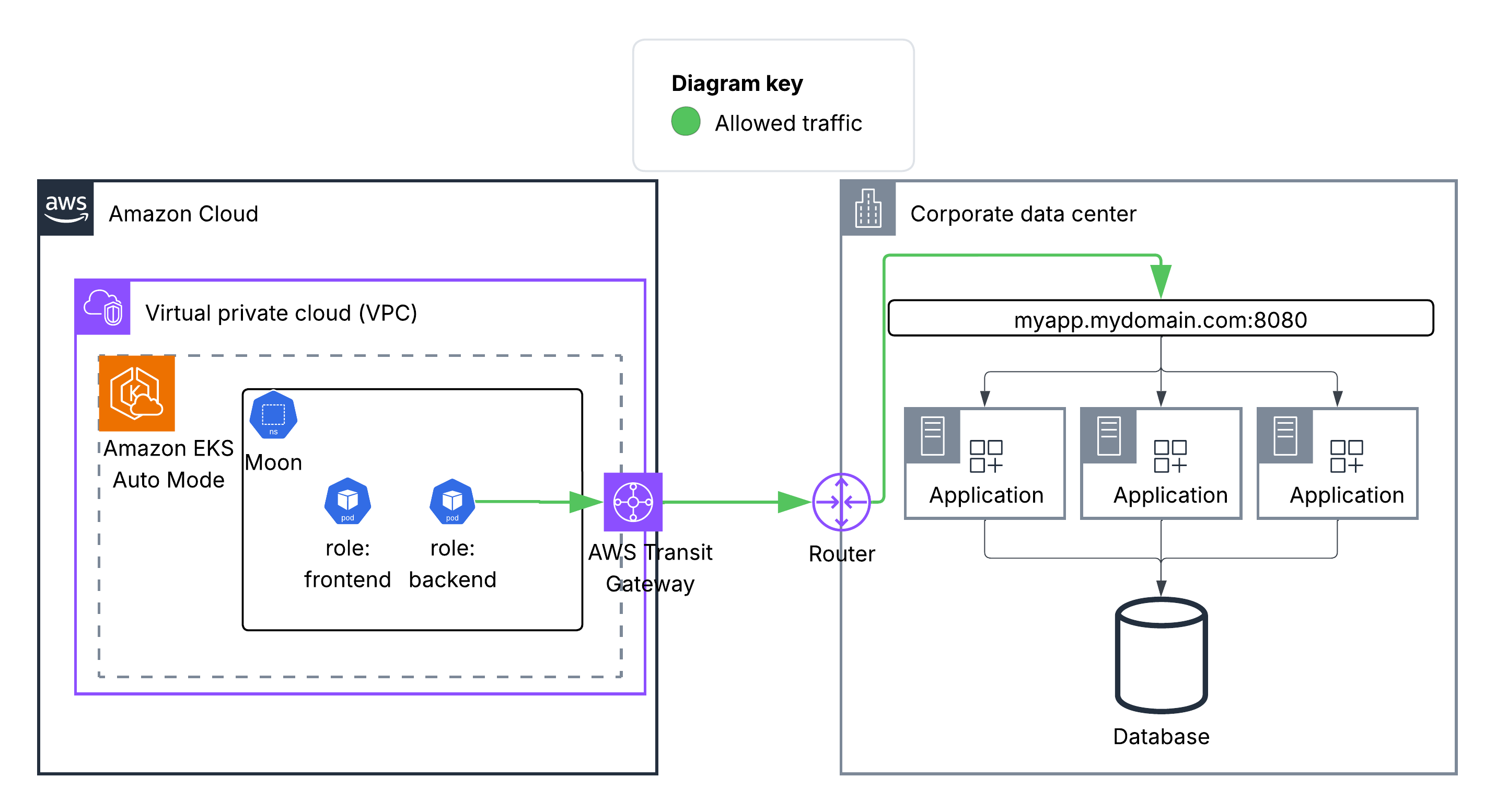 At the Kubernetes network level, this would allow egress from any pods in the “moon” namespace labelled with role: backend to connect to the domain name myapp.mydomain.com on TCP port 8080 as shown below. You would also need to set up the network connectivity to egress your VPC (potentially via an AWS Transit Gateway) and access into your Corporate Datacenter.