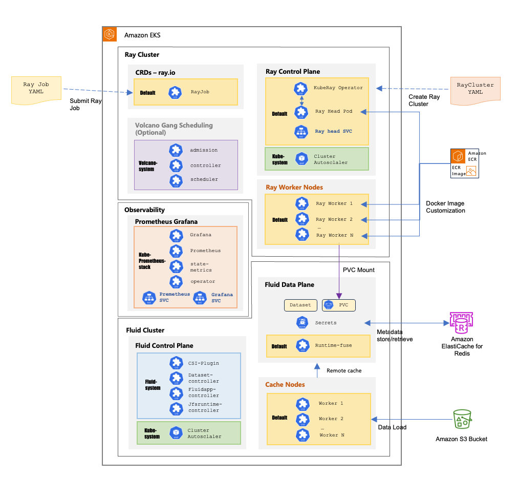 The following diagram demonstrates a comprehensive Amazon EKS architecture that integrates Ray Cluster for distributed computing with Fluid for intelligent data management. In this architecture Ray Jobs are submitted through YAML configurations to create scalable clusters managed by the KubeRay Operator with a Ray Head Pod coordinating multiple worker nodes. At the same time, the Fluid system provides a two-layer architecture consisting of a control plane managing CSI plugins and various controllers alongside a data plane handling datasets and persistent volume claims with distributed cache worker nodes that store frequently accessed data from Amazon Simple Storage Service (Amazon S3). All of this is monitored by a Kube-prometheus-stack with Prometheus collecting metrics and Grafana providing visualization dashboards, with external integrations including Amazon ElastiCache for Redis managing metadata, Amazon Elastic Container Registry (Amazon ECR) supplying customized Docker images, and a Cluster Autoscaler automatically adjusting resources based on workload demands to enable efficient distributed computing with reduced latency through local caching while maintaining dynamic scalability.