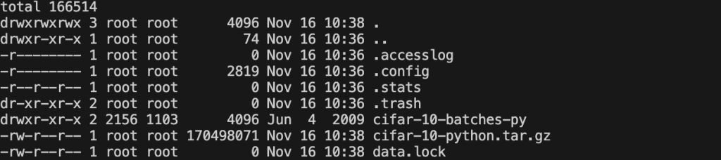 You can check the status of the training data using the following command:kubectl exec -it data-load-pod -- /bin/bash -c "cd /data && ls -la" The terminal console shows all of the files under /data of pod data-load-pod: