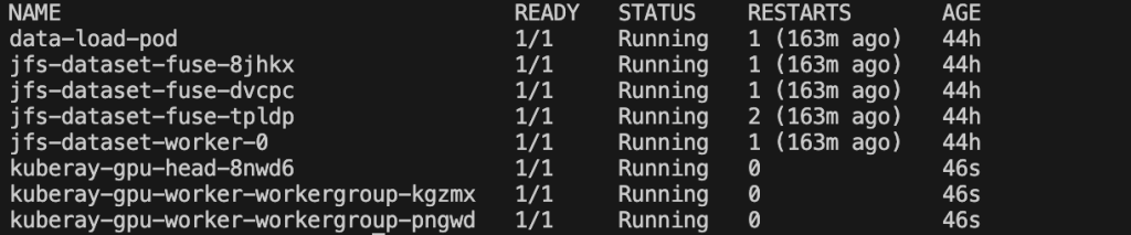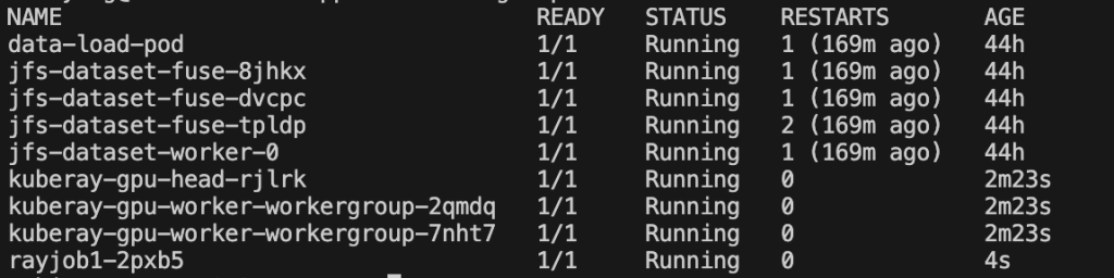 After the EKS cluster is set up, a Ray Cluster CRD is created by running a YAML file kubectl create -f raycluster-with-jfs.yaml. As EKS cluster CRDs, Amazon EKS hots them as running pods, including Ray head nodes and worker nodes in the default namespace. Moreover, volcano-admission, volcano-controller, and volcano-scheduler pods in the volcano-system namespace if Volcano is used.The benefits of using CRDs for Ray nodes include the following: