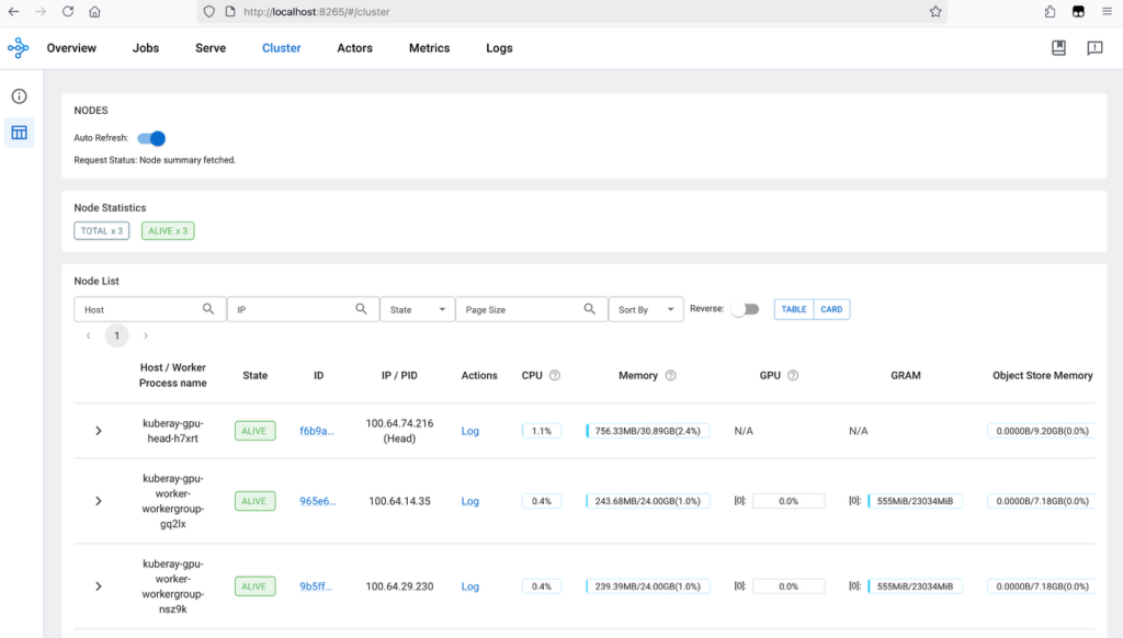 Visit localhost:8265 on the local browser. The default dashboard is the Overview dashboard. Switch to the Cluster dashboard to get the information of the Ray Cluster. The following figure shows the Ray Cluster dashboard showing three worker nodes active: