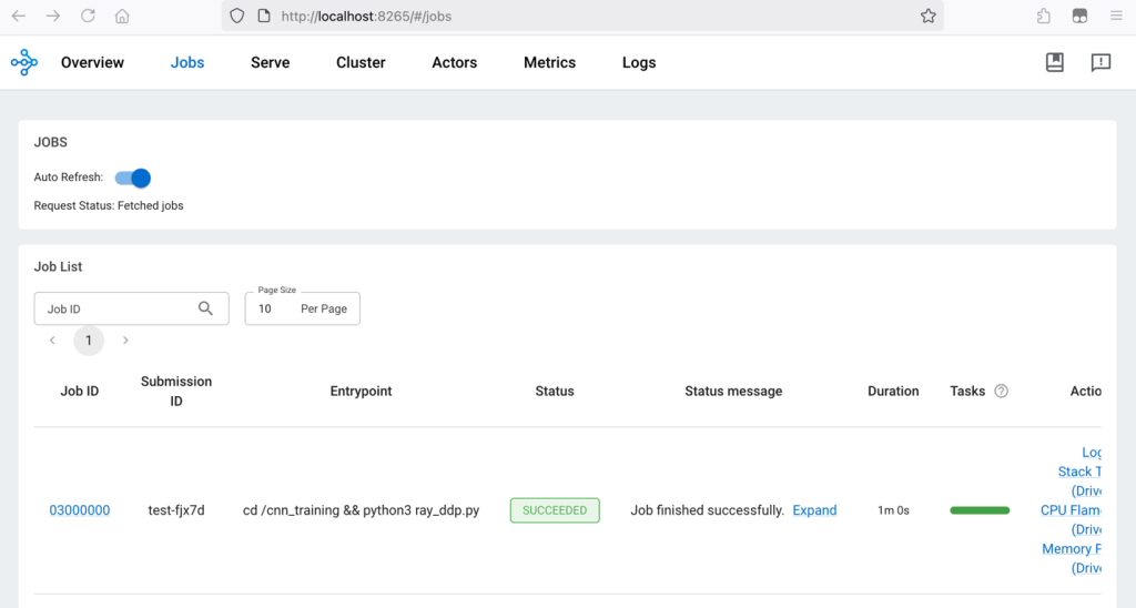 Visit localhost:8265 on the local browser and switch to the Job tab. The Ray Cluster dashboard shows that the Ray Job has finished successfully: