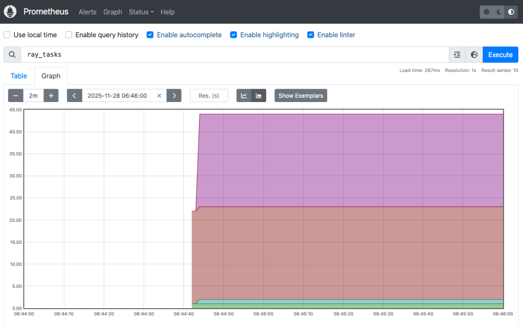 drop down list to show the Ray tasks status. The Prometheus dashboard, shown in the following figure, shows the running timeline of Ray tasks: