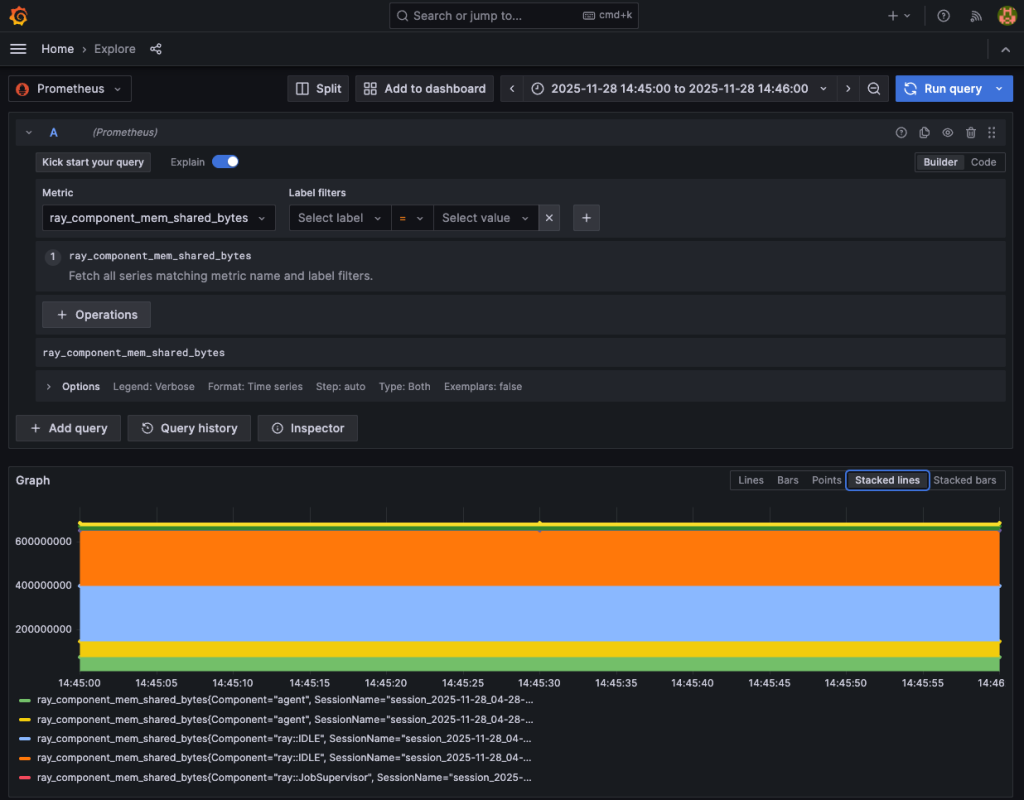 Create a new dashboard by choosing Dashboards or Explore. Choose Prometheus as the data source, then find ray_component_mem_shared_bytes in the Metric dropdown list. The Grafana dashboard shows the memory taking status of the Ray Cluster components: