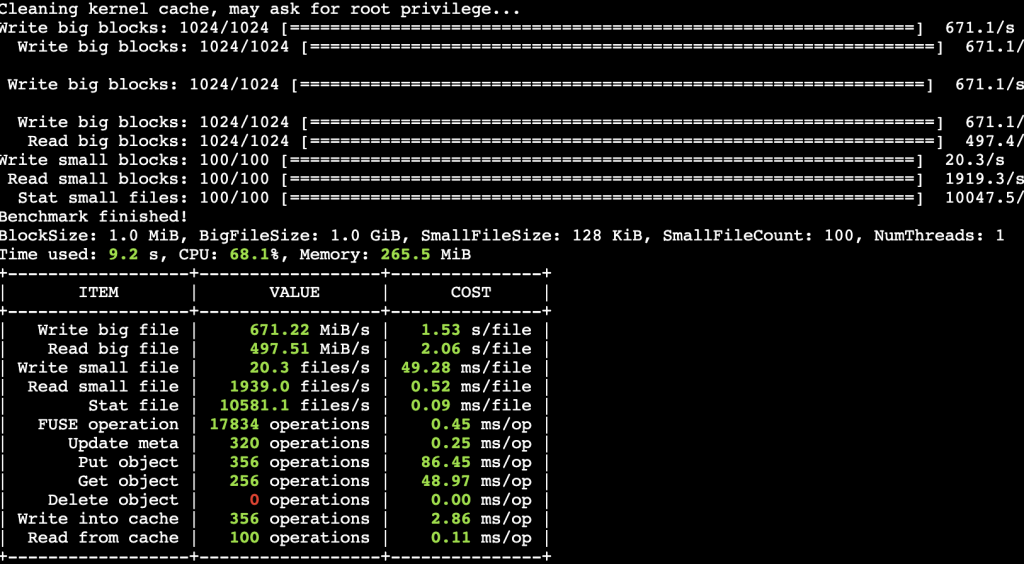 Initially, you set up a JuiceFS instance and associate the S3 bucket as the raw data backup media, and the ElastiCache for Redis instance as the metadata engine. The JuiceFS exposes itself as a mount point in the application’s file system (for example data dir under root, /data). For the first time, after you load your data into the page cache, JuiceFS automatically asyncs the data to read buffer, generates the chunking structure, and stores the metadata in Redis through TCP and the chunked raw data into Amazon S3. If there is another user who wants to use the target data at the same time, then they mount the JuiceFS file system mount point and the data is ready for use. The next time if you use this target data (the JuiceFS file system has been released, so it’s the data in cache), after setting up the JuiceFS file system and mount it in your application’s OS, then you can see the target data right under the mount point (/data). However, the data isn’t really in the page cache at that moment. When you operate the target data (read/write), JuiceFS uses the metadata to find the right target data and load the target data through block cache index, read buffer, and ultimately in page cache. Therefore, the performance of the first time reading the existing data is slower, because JuiceFS’ chunking strategy merges small files automatically during first time async the data, the data loading performance can reach 300-800 MBps or even higher, depending on the specs of the EC2 instance that is hosting the JuiceFS file system. JuiceFS offers a benchmark tool to test the performance of the JuiceFS file system. You can run juicefs bench <mount point> to get the detailed data of your JuiceFS file system. The following is the resulting snapshot of running the benchmark tool on a C5.xlarge EC2 instance.
