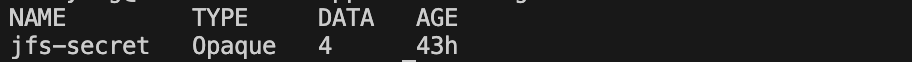 Check the status of Fluid. Furthermore, check the status of jfs-secret, the status of jfs-dataset, the status of jfs runtime, and the status of jfs pvc. Use the following command to check the status of jfs-secret: kubectl get secrets