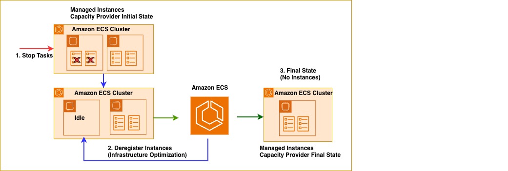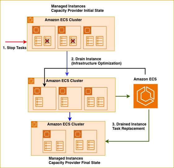 ECS Managed Instances launches right-sized EC2 instances based on your CP configuration and workload requirements. Over time, your EC2 instances may drift from workload requirements due to changing traffic patterns or dynamic scaling. ECS Managed Instances continuously optimizes infrastructure by draining underutilized instances and relocating tasks to more efficient capacity—either existing instances with available resources or newly provisioned right-sized instances. The following illustration shows optimization of underutilized instances in action: when two tasks stop, ECS recognizes the resource inefficiency and marks one underutilized instance as DRAINING. This reduces infrastructure from three instances to two, maintaining service availability while eliminating unnecessary compute costs.