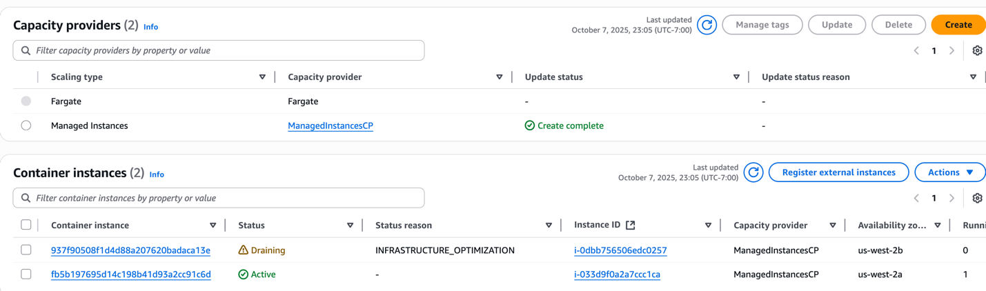 - 2 Managed EC2 instances in the Managed Instances Capacity Provider