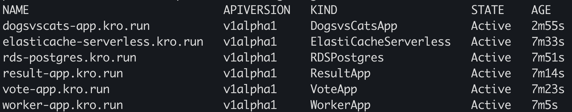 Notice that postgres, redis, voteapp, resultapp, and workerapp are themselves RGDs. RGD chaining enables a building blocks approach to platform engineering. Instead of creating monolithic RGDs that define everything, you can decompose your platform into small, focused RGDs that each do one thing well.
