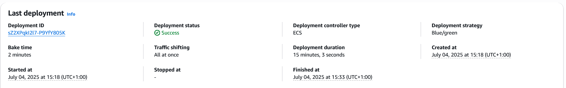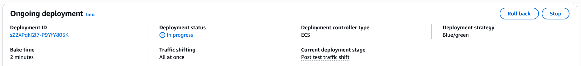 - You can monitor the ongoing deployment in the Amazon ECS console, watching the service move through the various lifecycle stages. When the deployment reaches the