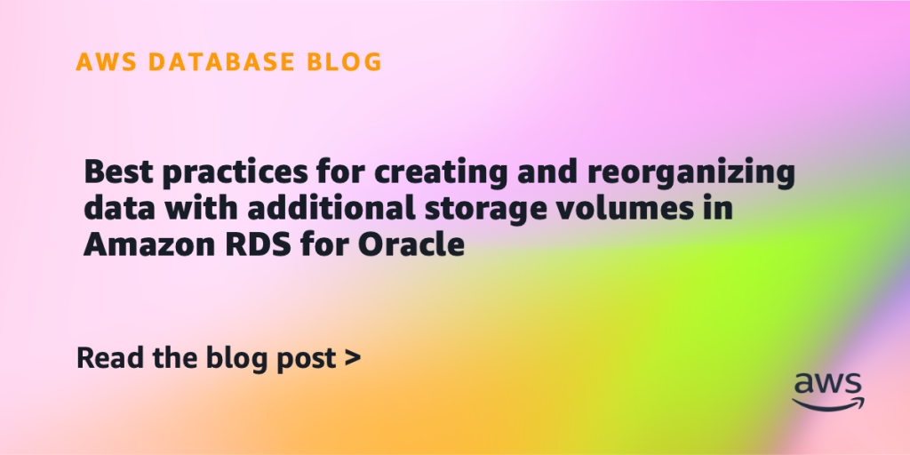 In this post, we show you how to use additional storage volumes to expand your RDS for Oracle storage capacity beyond 64 TiB. In addition, we walk through use cases for additional storage volume and best practices while working with additional volumes.