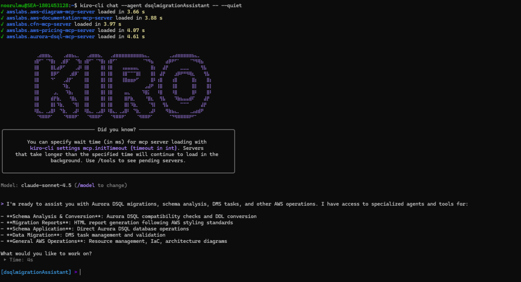 - Custom Kiro CLI agent – The central orchestration component that manages the migration workflow. It integrates four specialized MCP (Model Context Protocol) servers: AWS CFN MCP server for infrastructure provisioning , AWS Docs MCP server for documentation access , Aurora DSQL MCP server for database operations.