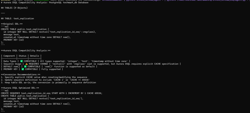 Validating AI-generated conversions – While the schema analyzer agent automates compatibility analysis and schema conversion, always validate the generated DDL against your specific business requirements and use cases. The agent-generated output provides a strong foundation, but manual review is required to verify that the converted schema aligns with your application’s needs. Thoroughly test the provided agent recommendations in non-production environments before applying changes to production systems.
