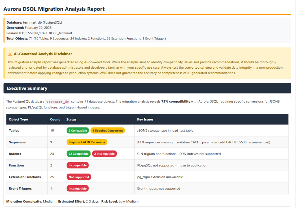 - Accelerated proof of concept – Rapidly evaluate Aurora DSQL for your workloads without extensive manual analysis. The automated compatibility assessment enables quick proof of concept (POC) turnaround, helping you make informed decisions about adopting Aurora DSQL.