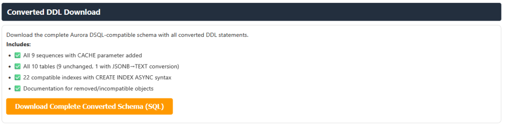The report also provides converted Aurora DSQL compliant table and database object DDL as a downloadable file. Review the compatibility analysis and recommendations to understand any required schema changes before proceeding with the migration.