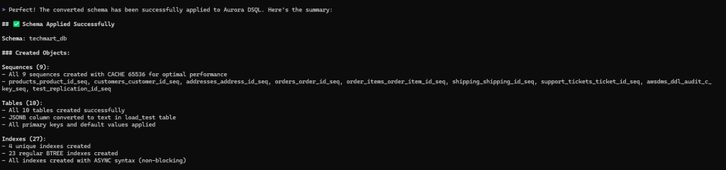 The converted objects are applied to the target Aurora DSQL with a single prompt.