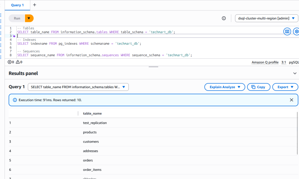 On the target Aurora DSQL, you can verify that the schema was created with tables, sequences, and indexes.