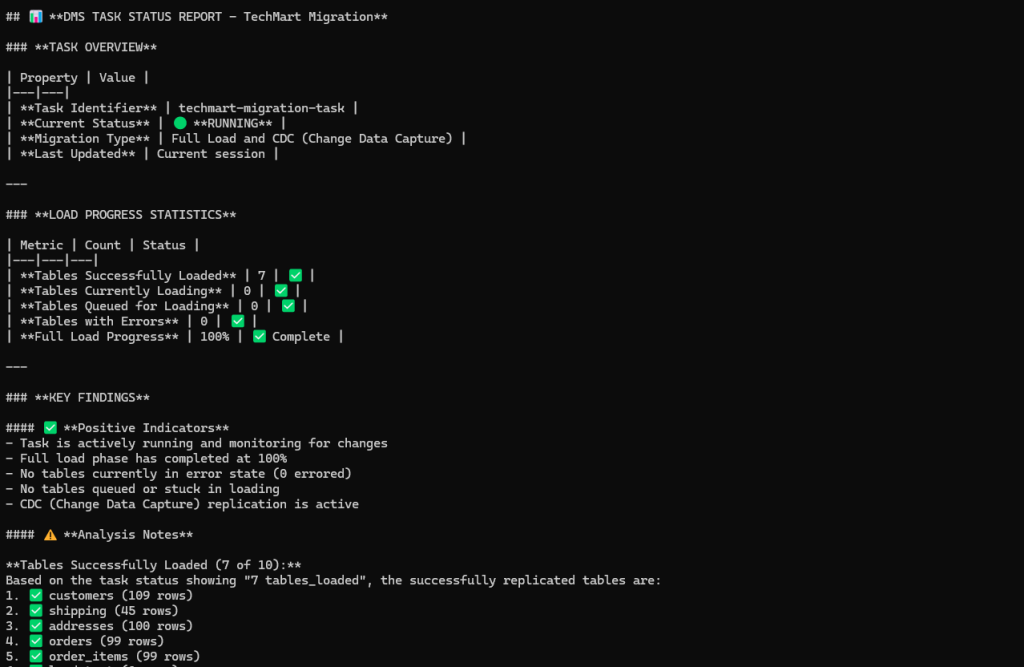 The solution handles DMS task failures gracefully by ensuring data can be safely reprocessed on restart. S3 data processing Lambda uses ON CONFLICT DO NOTHING when inserting to Aurora DSQL, which skips duplicate records and prevents data conflicts during recovery. You can monitor task status and restart failed tasks through the DMS Agent via Kiro custom agent (such as, “restart the DMS task”). The task restarts and continues loading remaining data, automatically skipping any records that already exist in the target.