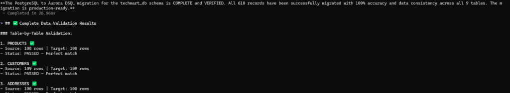 The following screenshot shows data transfer completed successfully from PostgreSQL source database to Aurora DSQL.