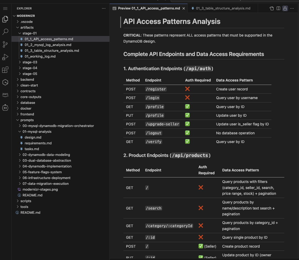 Using automated analysis tools, you first examine your existing MySQL database structure. The workshop automatically analyzes MySQL performance logs, table structures, and backend code to discover your current data architecture and relationships. Instead of manual cataloging, the system documents your database schemas and identifies access patterns.The analysis output shown in the following screenshot shows one artifact with the API access patterns documented, including its methods and API path.