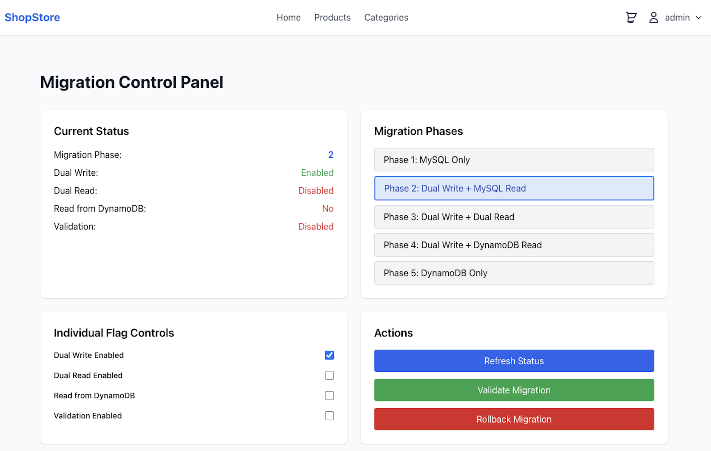 The workflow implements a comprehensive feature flag system that enables gradual, reversible transitions between MySQL and DynamoDB. These feature flags provide fine-grained control over database operations, supporting dual-write scenarios where data is written to both systems simultaneously and dual-read scenarios where responses from each database are evaluated against each other to check for consistency. This approach supports a thorough validation of data consistency and application behavior before proceeding with the full cutover. Through an intuitive admin console, you can monitor and control each aspect of the migration, achieving a safe and controlled modernization process.As shown in the following screenshot of the admin console interface, you can control feature flags and monitor each phase of your migration progress in real time.