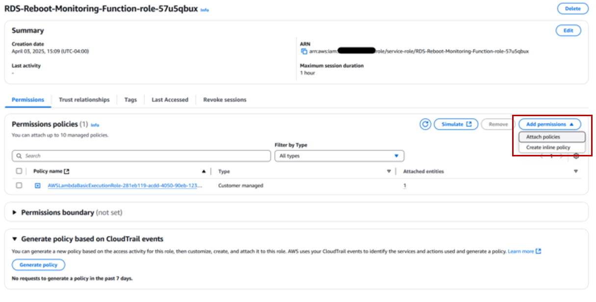 For this solution, we create an AWS Identity and Access Management (IAM) policy that we later attach with the default Lambda execution role. This IAM policy allows Lambda to collect CloudWatch metrics, describe RDS instances, get Performance Insights data, gather CloudTrail data, and send emails using Amazon SES.