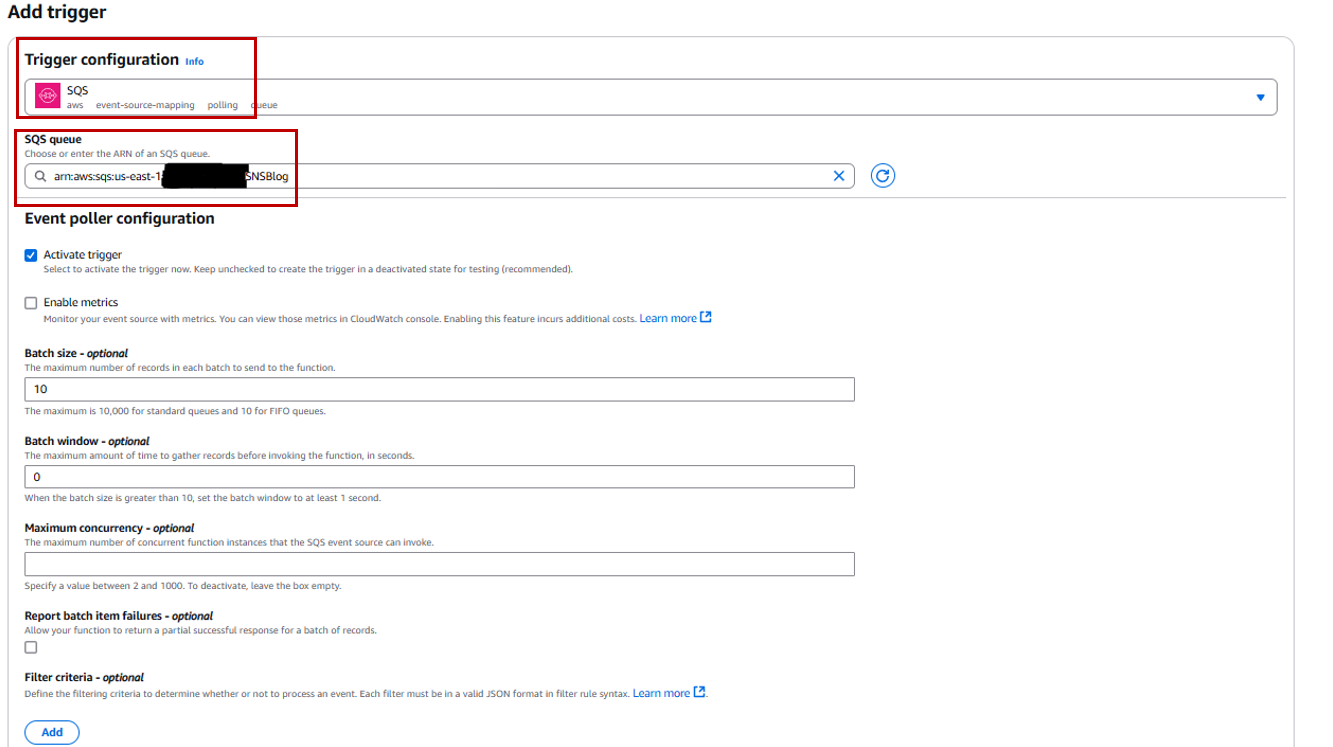 For Trigger configuration, choose SQS as the source and search for the SQS queue you created in the previous step.