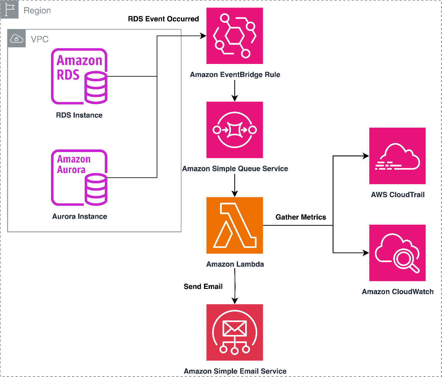 When an RDS or Aurora instance experiences an operational event such as a reboot or failover, an Amazon EventBridge rule identifies this and triggers an AWS Lambda function. This function will gather the last 10 minutes of metrics for the RDS impacted instance. This includes relevant CloudTrail events, CloudWatch metrics, and top SQL queries gathered from Performance Insights. An Amazon Simple Queue Service (Amazon SQS) queue adds a delay to the email, allowing additional time for potential CloudTrail events to be published. The Lambda function curates this information and sends it to a list of pre-configured emails using Amazon Simple Email Service (Amazon SES).