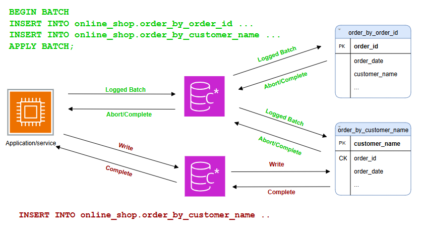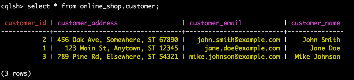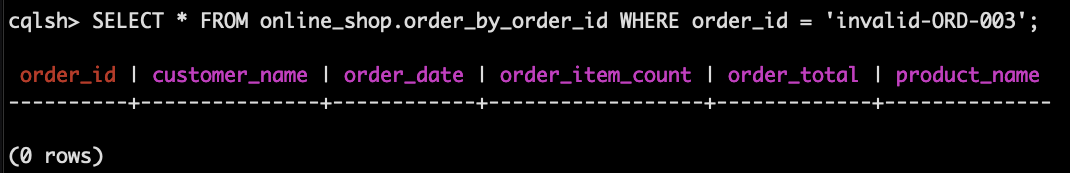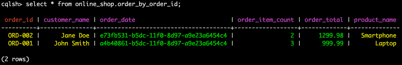 order_by_order_idandorder_by_customer_nametables; this keeps different tables and their access patterns in sync:- Validate the data is inserted correctly